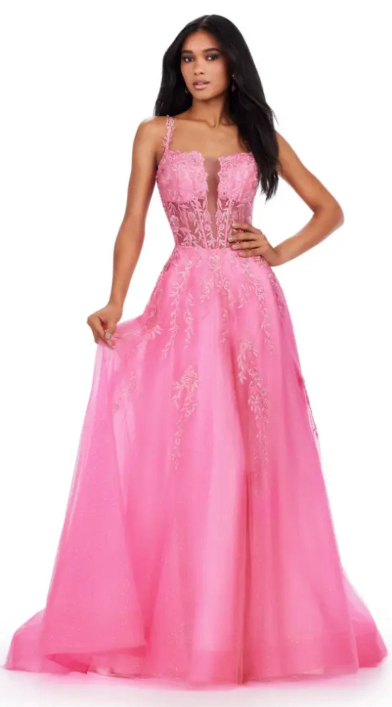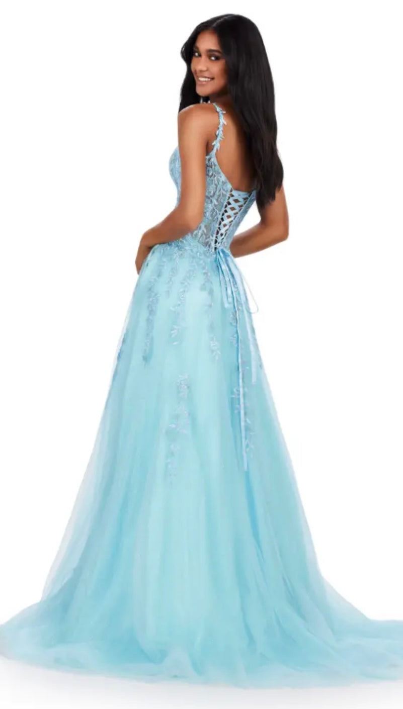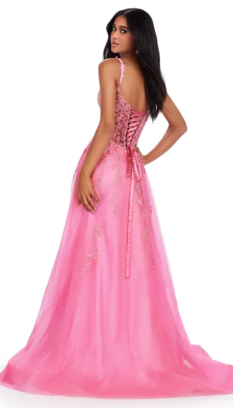 Living in a fairytale! This spaghetti strap gown features a v- neckline with a lace appliqué bodice. The lace up back and glitter tulle skirt completes the look. Some items may be on backorder or drop-ship. Contact sales for details.