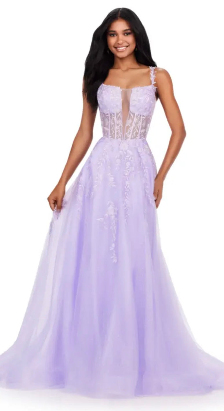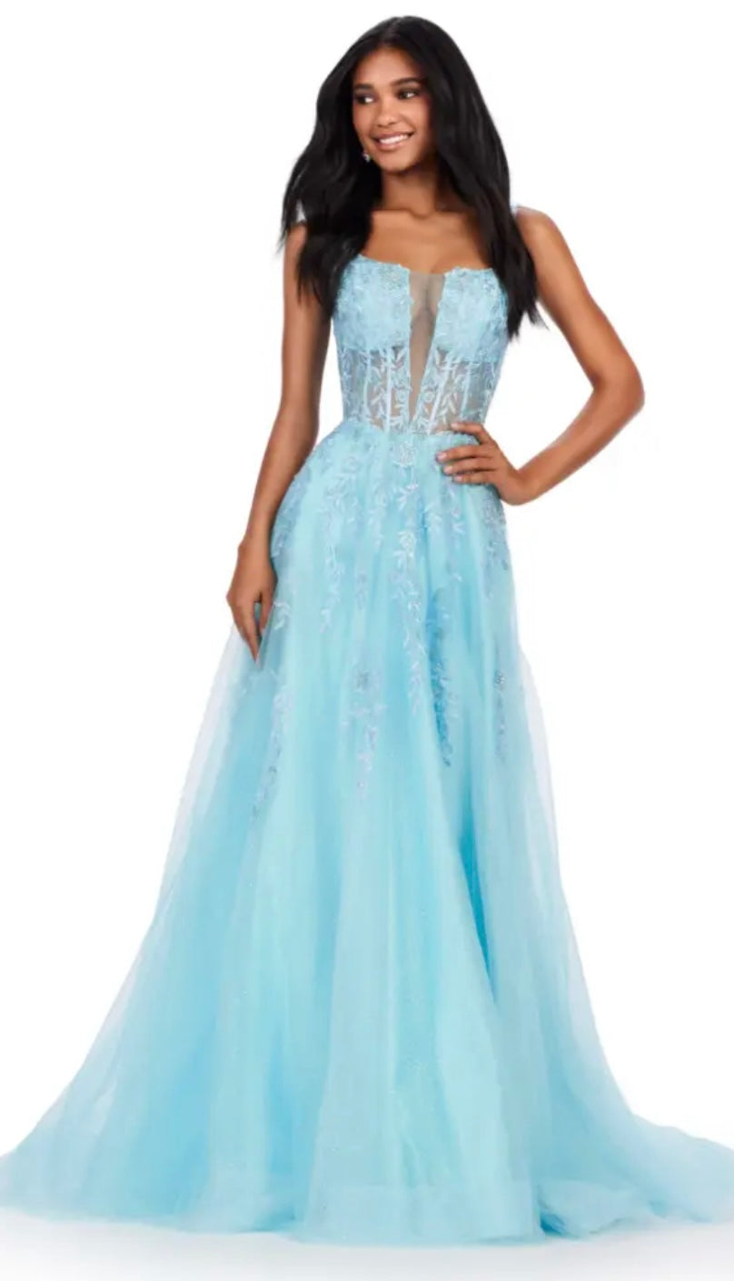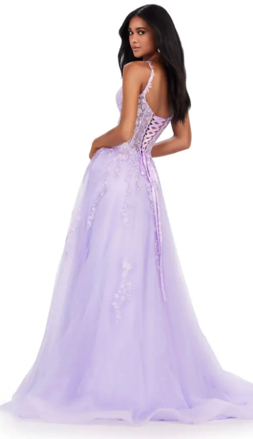 Living in a fairytale! This spaghetti strap gown features a v- neckline with a lace appliqué bodice. The lace up back and glitter tulle skirt completes the look. Some items may be on backorder or drop-ship. Contact sales for details.