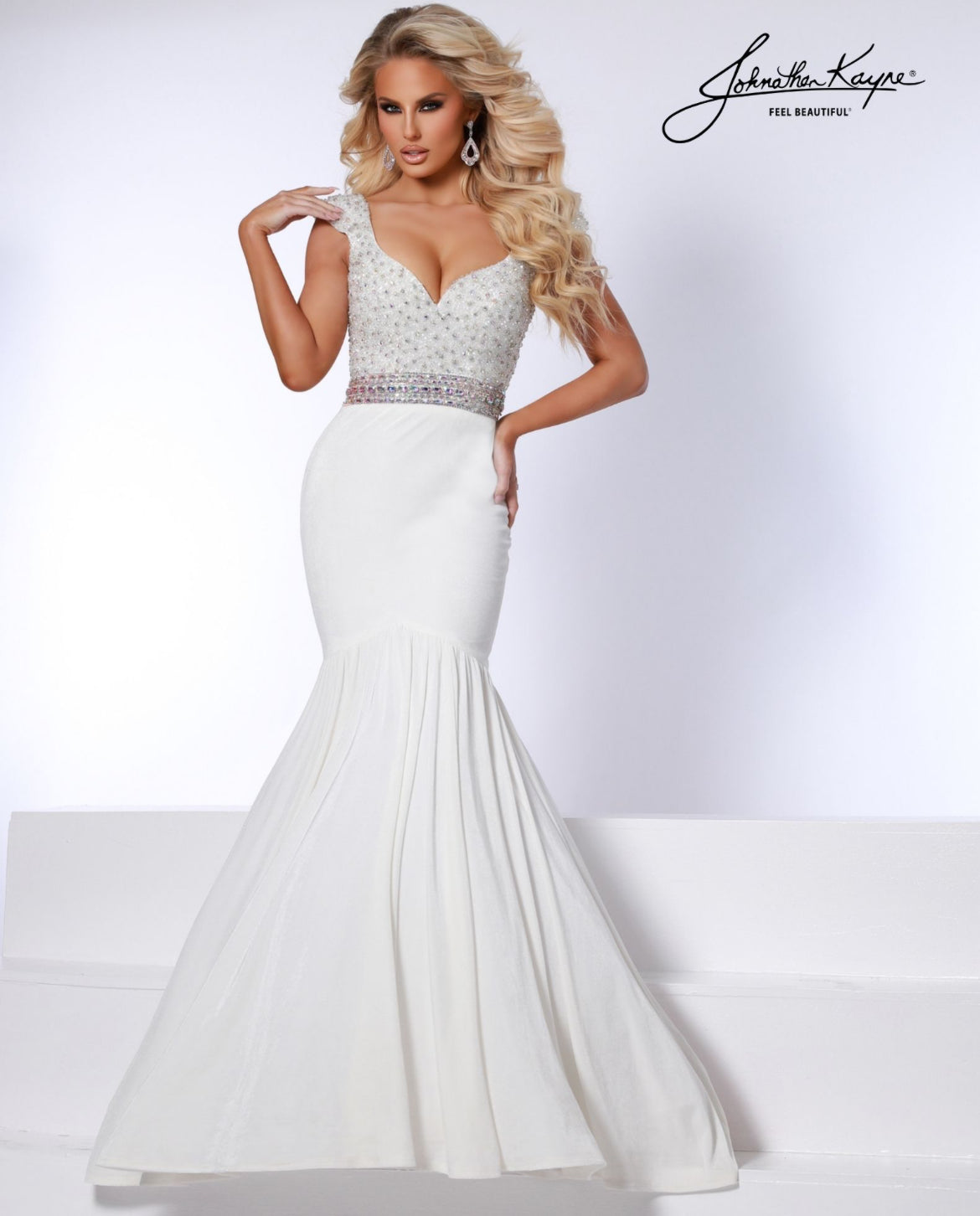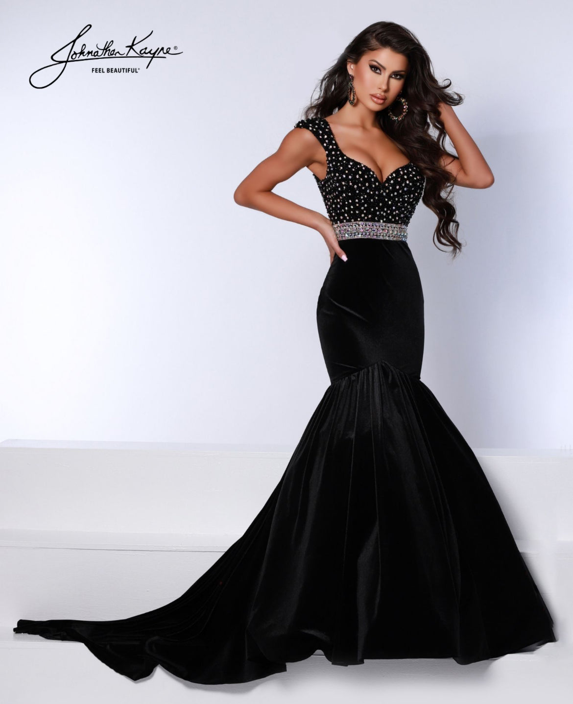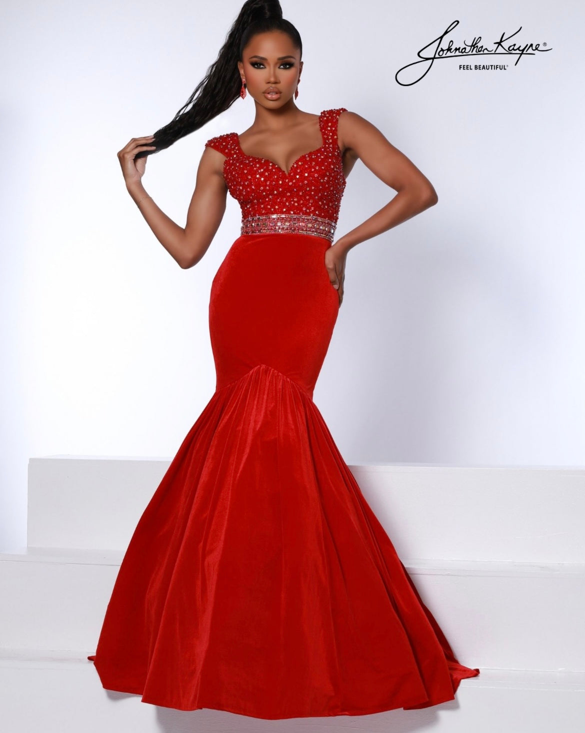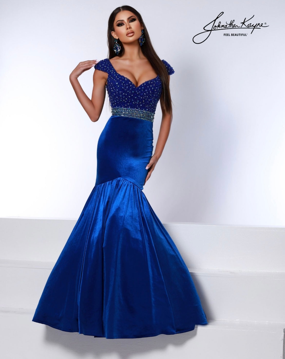 Luxurious velvet! Dazzle the crowd in this stretch velvet, mermaid gown that has a fully beaded bodice, classic sweetheart neckline, cap sleeves, and a crystal trim belt to finish the look.