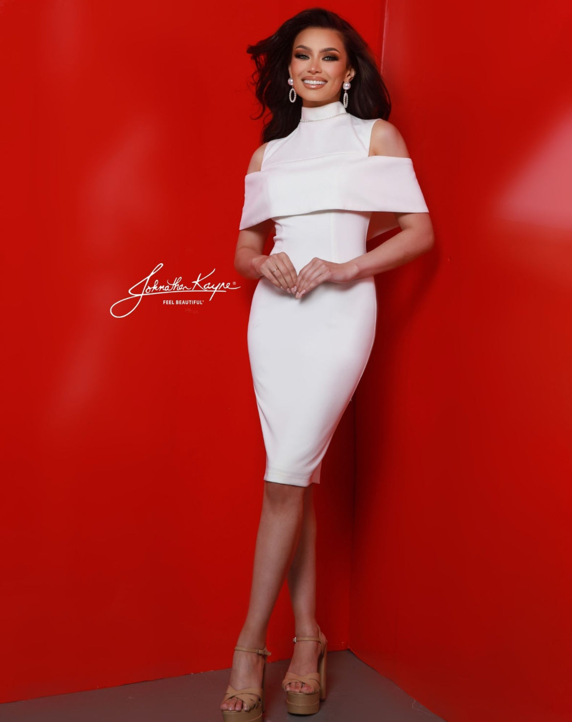 Command the room when you walk into the interview room! This chic mock neck, off-the-shoulder cocktail dress is your lucky charm. Stretch crepe with a full zipper back makes for a comfy, elegant feel.