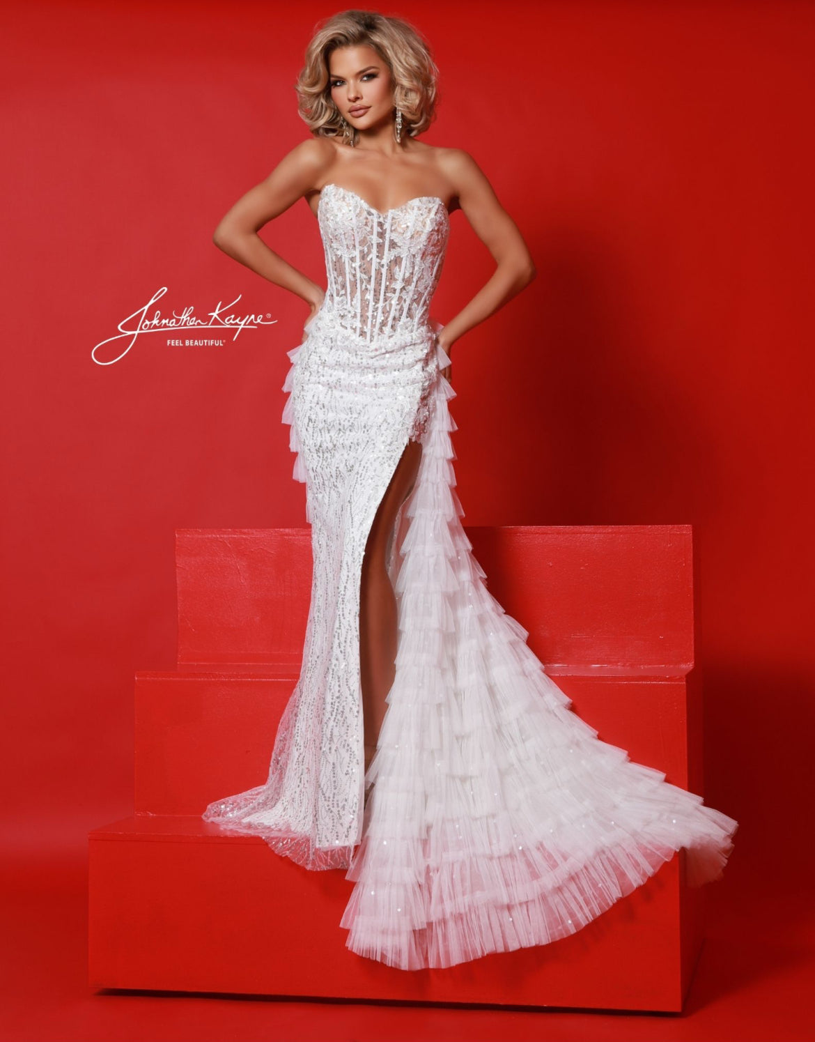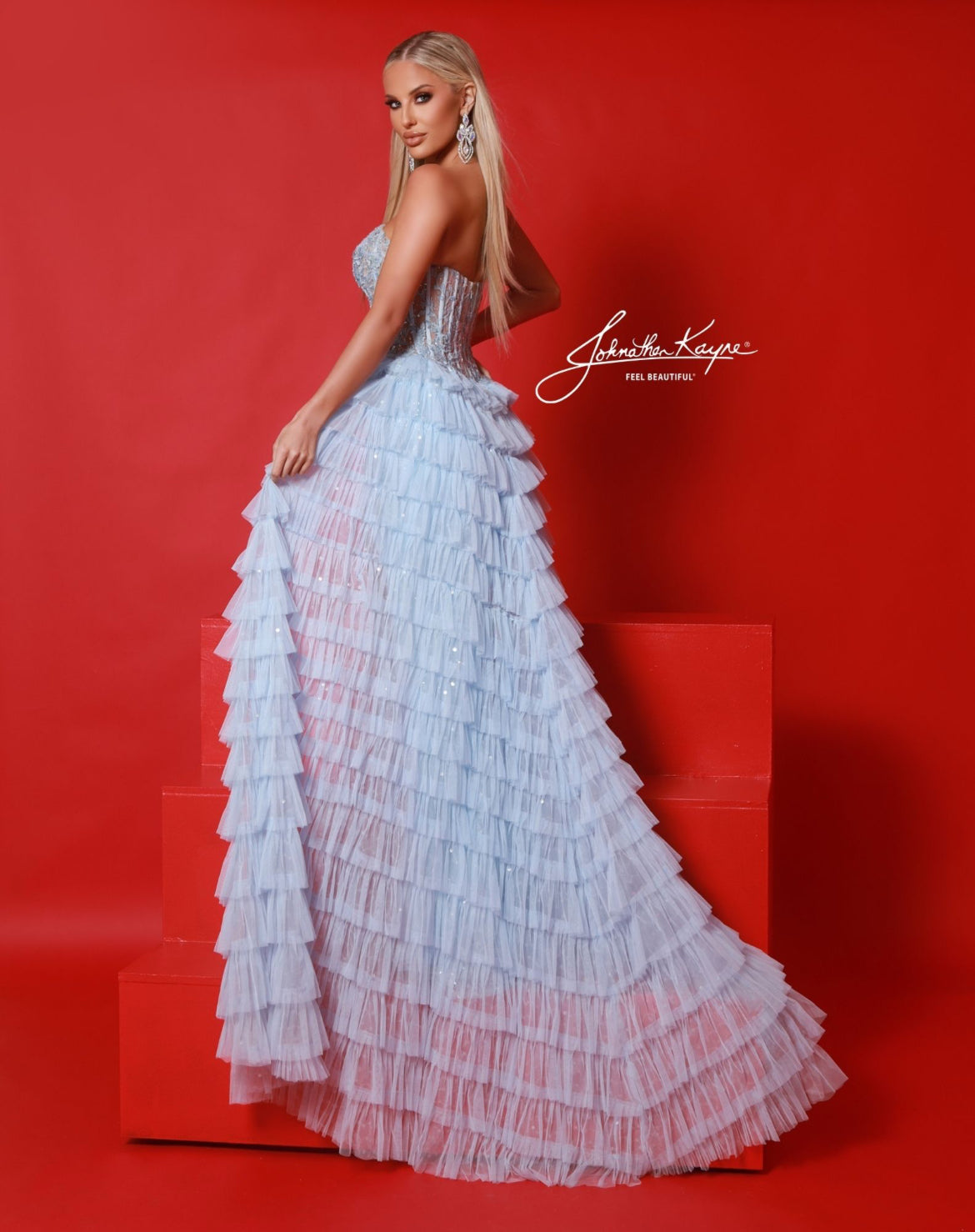 This beautiful embroidered sequin power mesh, strapless gown has exposed boning with a tiered ruffle overskirt brings drama for all the right reasons. Ready to own the spotlight? This is it!